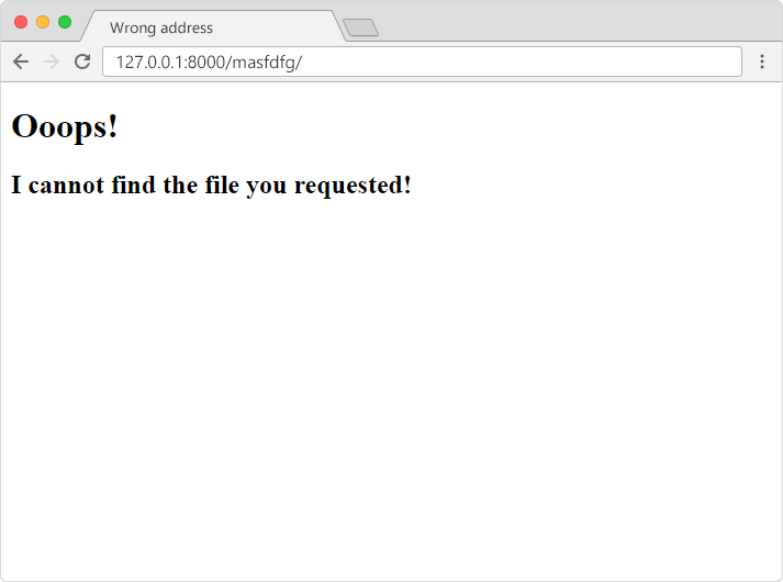 In the browser window, type 127.0.0.1:8000/masfdfg/ in the address bar.