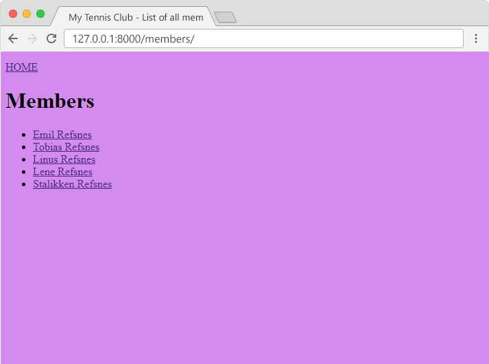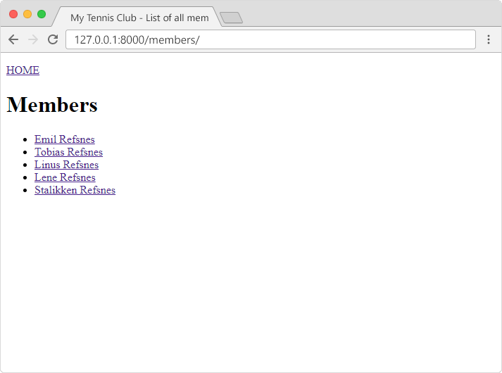 In the browser window, type 127.0.0.1:8000/members/ in the address bar.