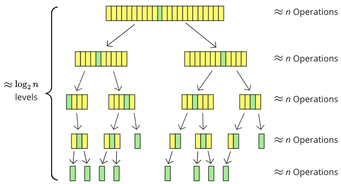 The pivot element (green) is moved into the middle, and the array is split into sub-arrays (yellow). There are 5 recursion levels with smaller and smaller sub-arrays, where about \(n\) values are touched somehow on each level: compared, or moved, or both.