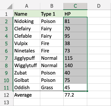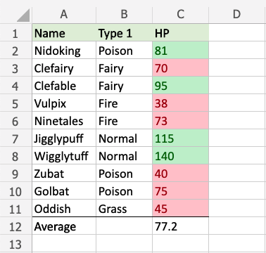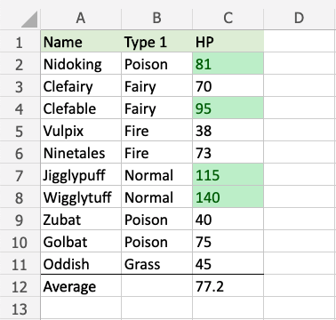Now, the cells with above average HP values (more than 77.2) will be highlighted in green: