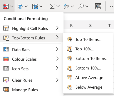 in the ribbon, from Home menu - Select Top/Bottom Rules from the drop-down menu