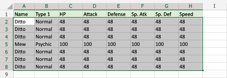 All of Ditto's stat values are 48 and all of Mew's stat values are 100, so they are all highlighted.