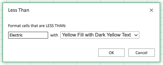 Now, the cells with text values earlier in the alphabet than "Electric" will be highlighted in yellow: