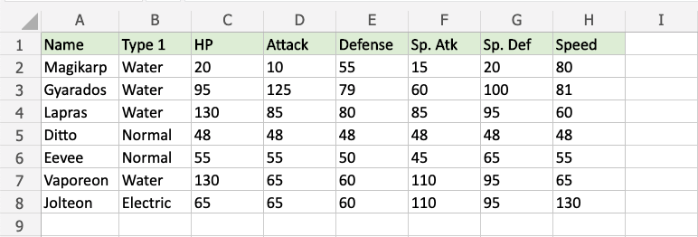 Only Magikarp and Ditto have Attack values less than 55, so these values are highlighted.