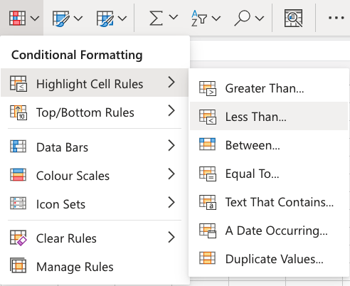 Here is the Highlight Cell Rules part of the conditional formatting menu: