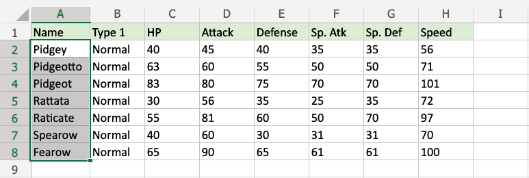 The names "Pidgey", "Pidgeot", and "Pidgeotto" all start with "Pidge", so all these cells are highlighted.