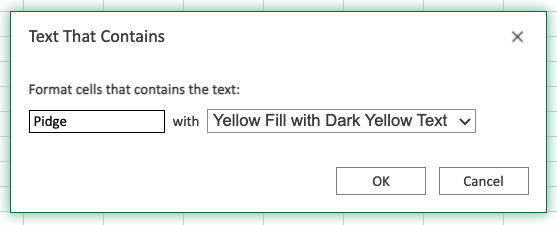 Now, the cells with values Text That Contains "Pidge" will be highlighted in yellow: