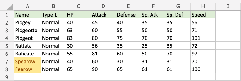 The names "Spearow" and "Fearow" both end with "row", so both cells are highlighted.