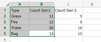 The chart gives a visual overview for the "Grass", "Fire", "Water" and "Bug" type Pokemons in generation 1 and 2.