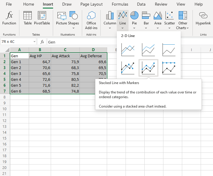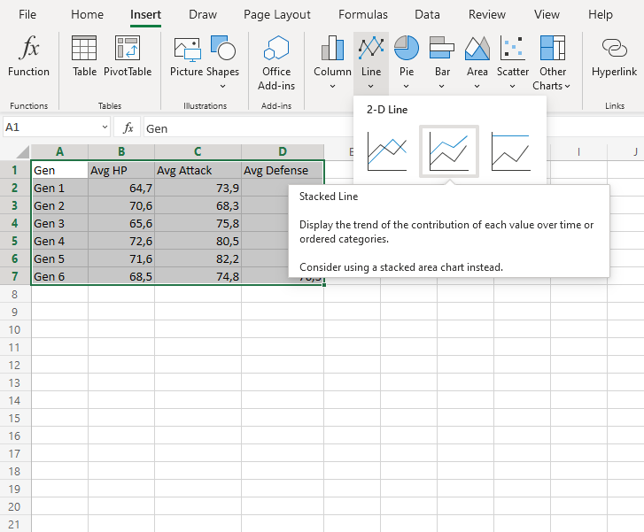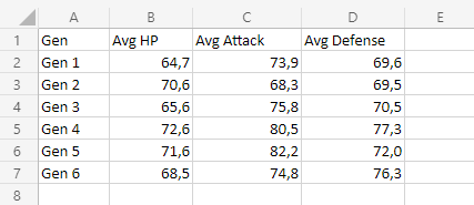 The chart gives a visual overview for the average Pokemon stats over generations.