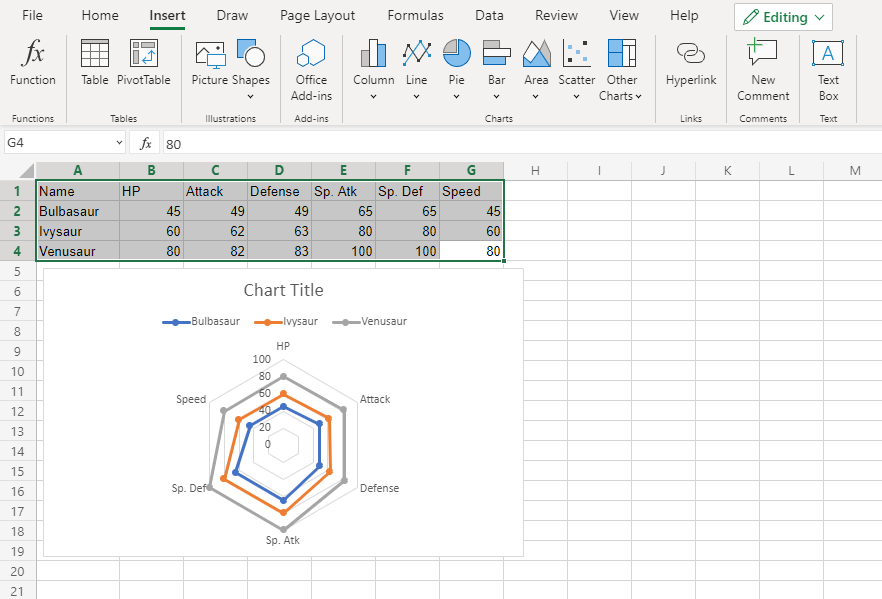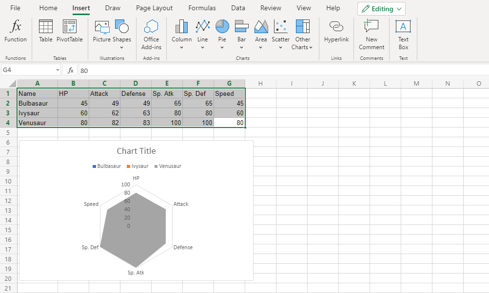 In this chart, Venusaur, which is shown in gray, overshadows all the other Pokemon.