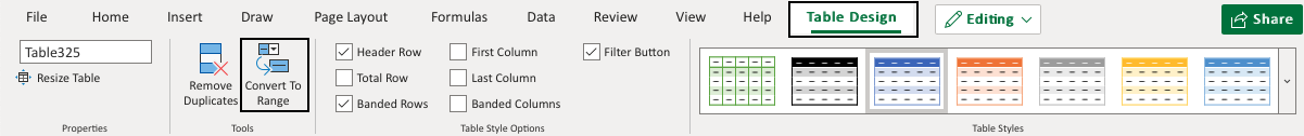 Tables can be converted to ranges by selecting a cell in the table range and clicking on the Convert to Range command.