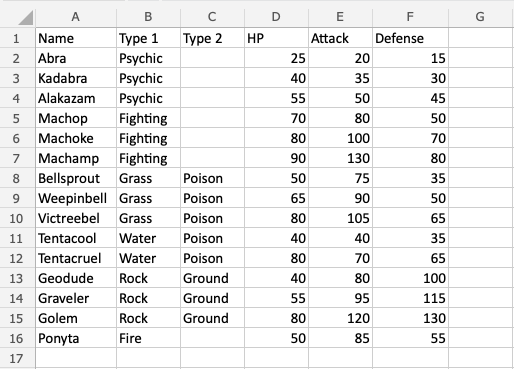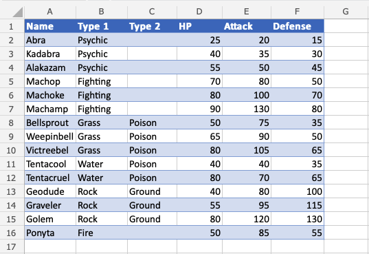 A1:F16)
