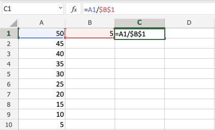 Good job! You have successfully used absolute reference to divide B1(5) with the range A1:A10.