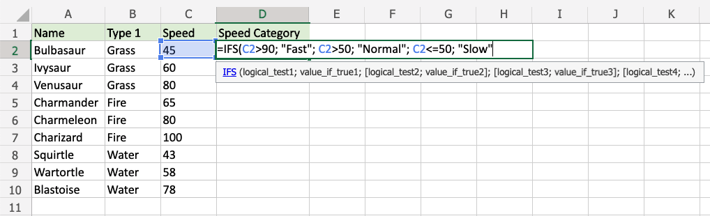 Since the value in cell C2 is "45", the first and second conditions are false, and third condition is true (less than or equal to 50), the function will return "Slow".