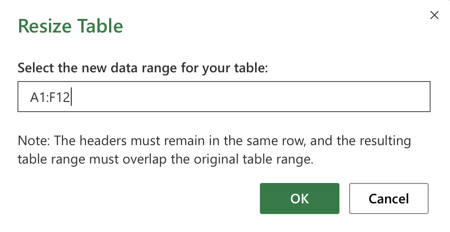 Great! The table has been resized to from A1:F12 to A1:F20.