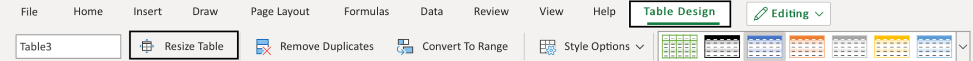 Note: Cells outside of the table range are no longer included in the table. The connection between the cells created by the table is broken and they no longer have the table formatting.