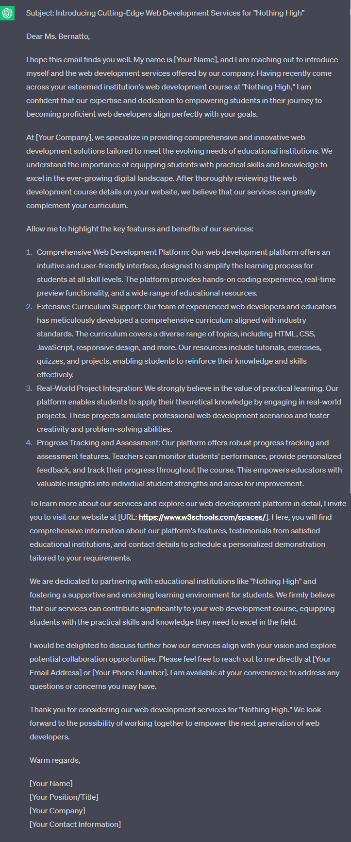 Write a professional email introducing our services to a potential client. The product is detailed here: "https://www.w3schools.com/spaces/". The client's name is "Nott Bernatto", and she is in charge of the web development course on "Nothing High", a high school in New York.