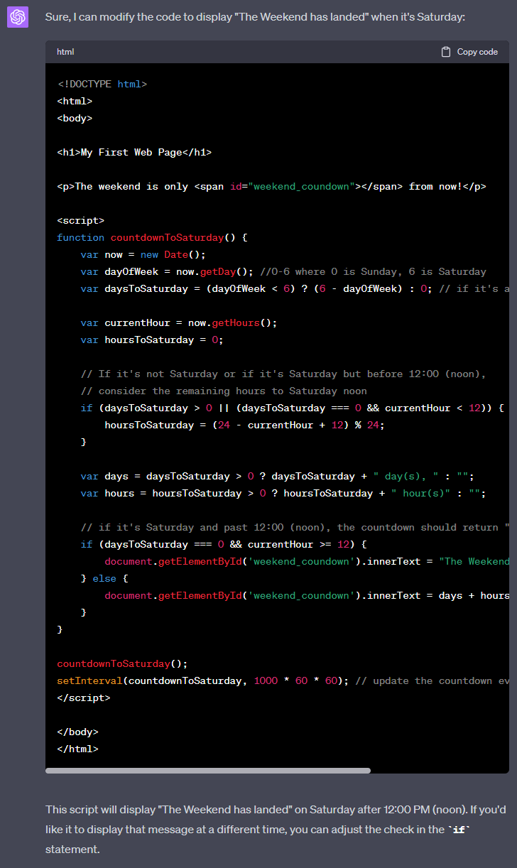 For example, write, "Create a function that counts down the number of days and hours until the next Saturday." instead of "Make code to find the closest Saturday"