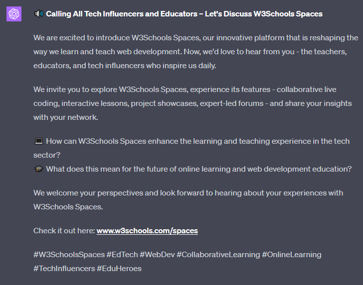 Create a Facebook post that asks tech influencers and teachers to discuss "W3Schools Spaces". Include a link to the product.