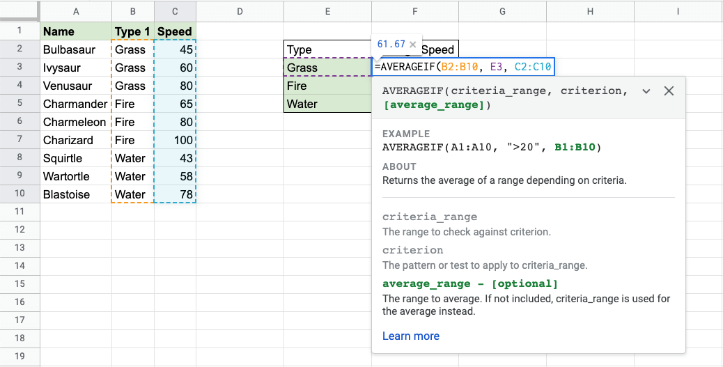 Google Sheets AVERAGEIF Function