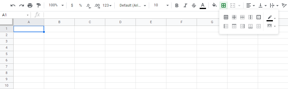 Borders can be added with different colors and styles. The border button remembers the border settings used the last time. The options are accessed from the border options button, next to the border button.