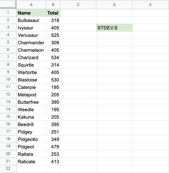 B2:B21for the Total stats for the sample Pokemon - Hit enter